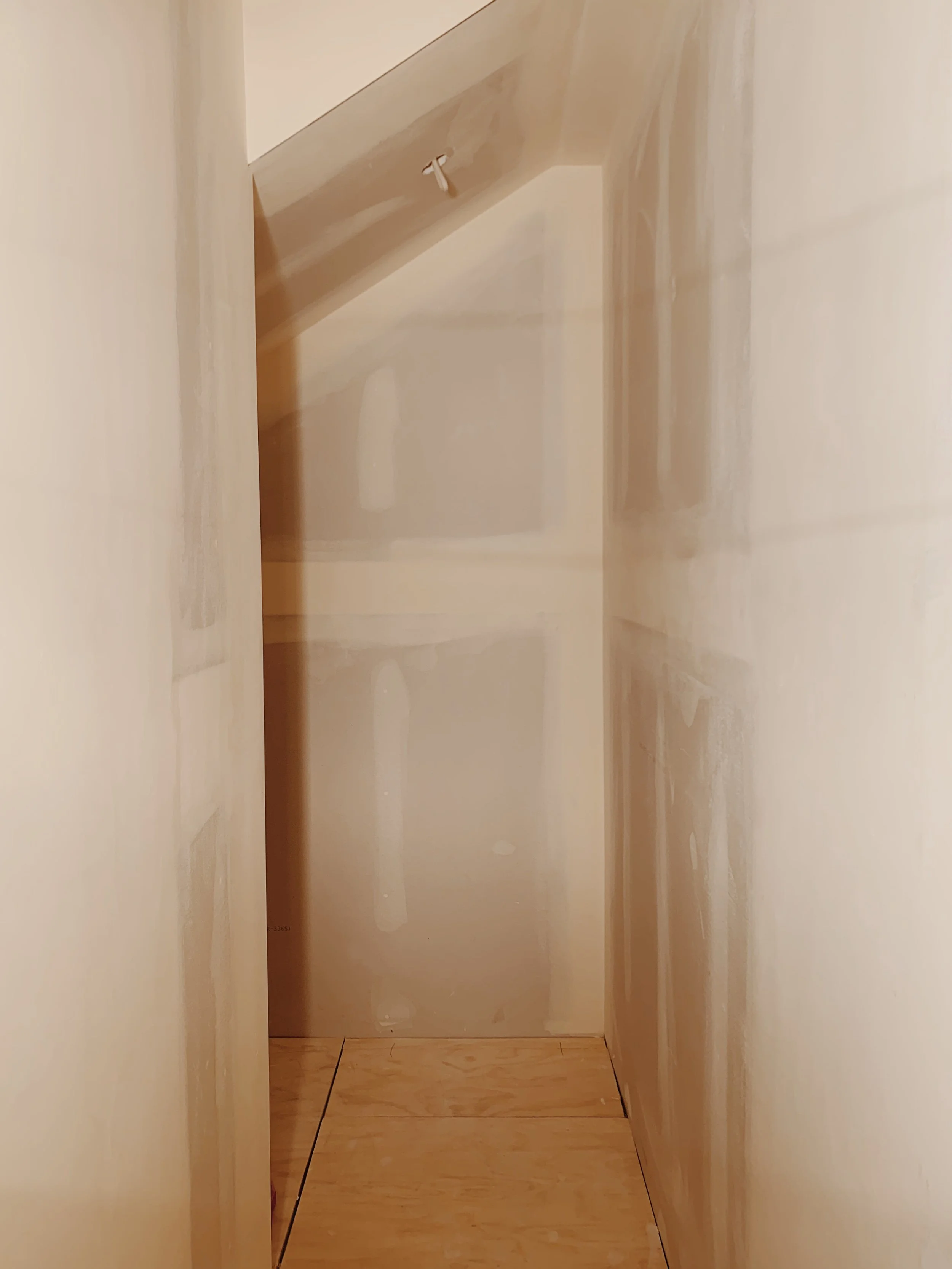 Back in 2018 when we moved the staircase we saw an awesome opportunity to create a walk-in closet in the space underneath. At the time though, we did not have the extra funds on top of not really having a plan yet for it so the space remained a deadzone for sometime. Then come 2021, we finished replacing all our windows as well renovating the office/guestroom and hallway and finally got this drywalled.